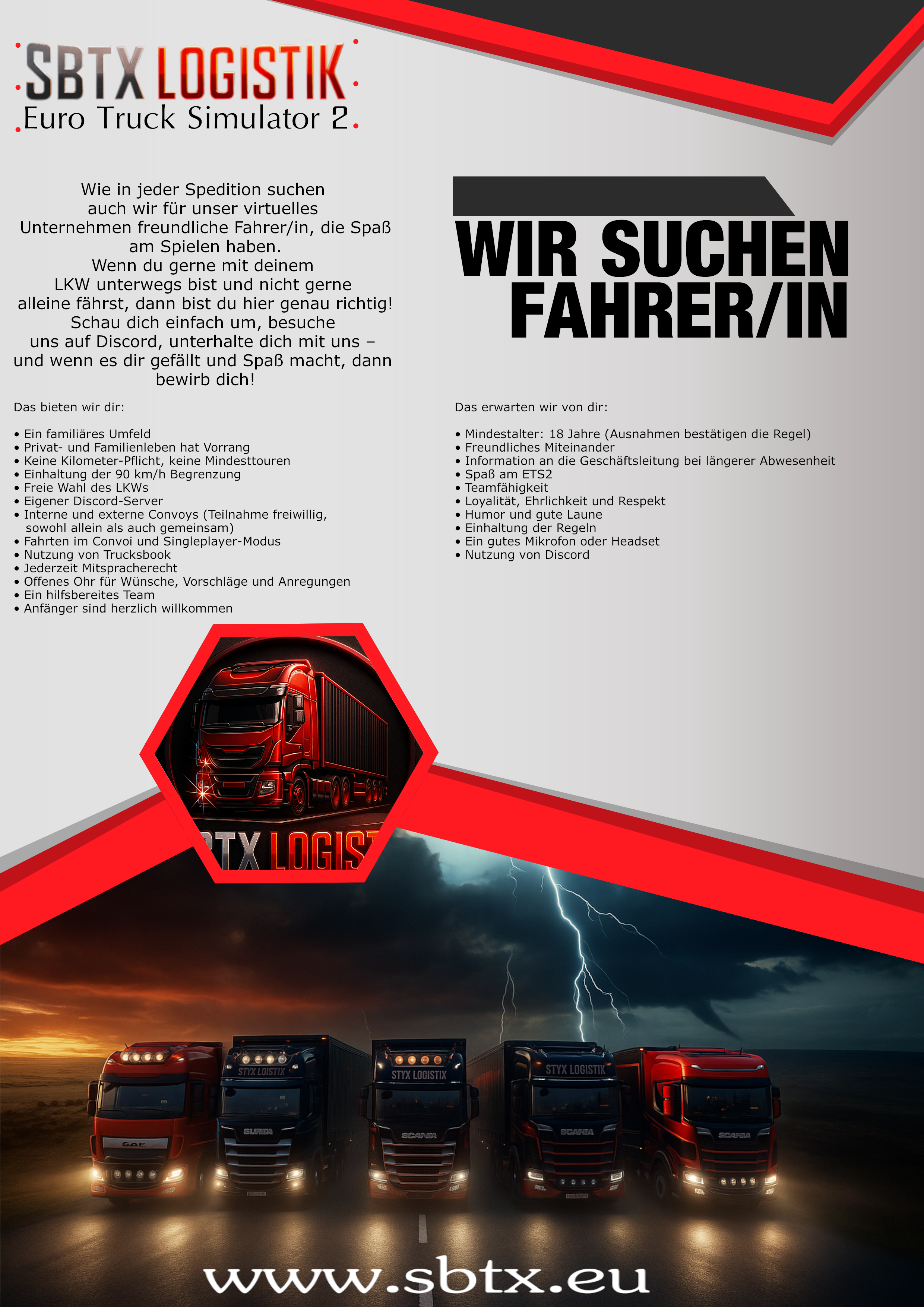 Wie in jeder Spedition suchen auch wir für unser virtuelles Unternehmen freundliche Fahrer/in, die Spaß am Spielen haben.